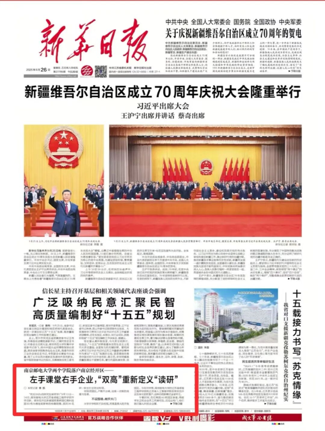 今日,《新华日报》头版以“南京邮电大学两个学院落户南京经开区——左手课堂右手企业,‘双高’重新定义‘读研’”为题全面报道南京经开区与南京邮电大学深化合作,深入推进“双高协同”行动、校地企融合,高标准共建全省首家实体落地开发园区的省级卓工学院和人工智能学院,打破产教壁垒、实现校地企与学生四方共赢,推动科技创新和产业创新深度融合的创新实践。