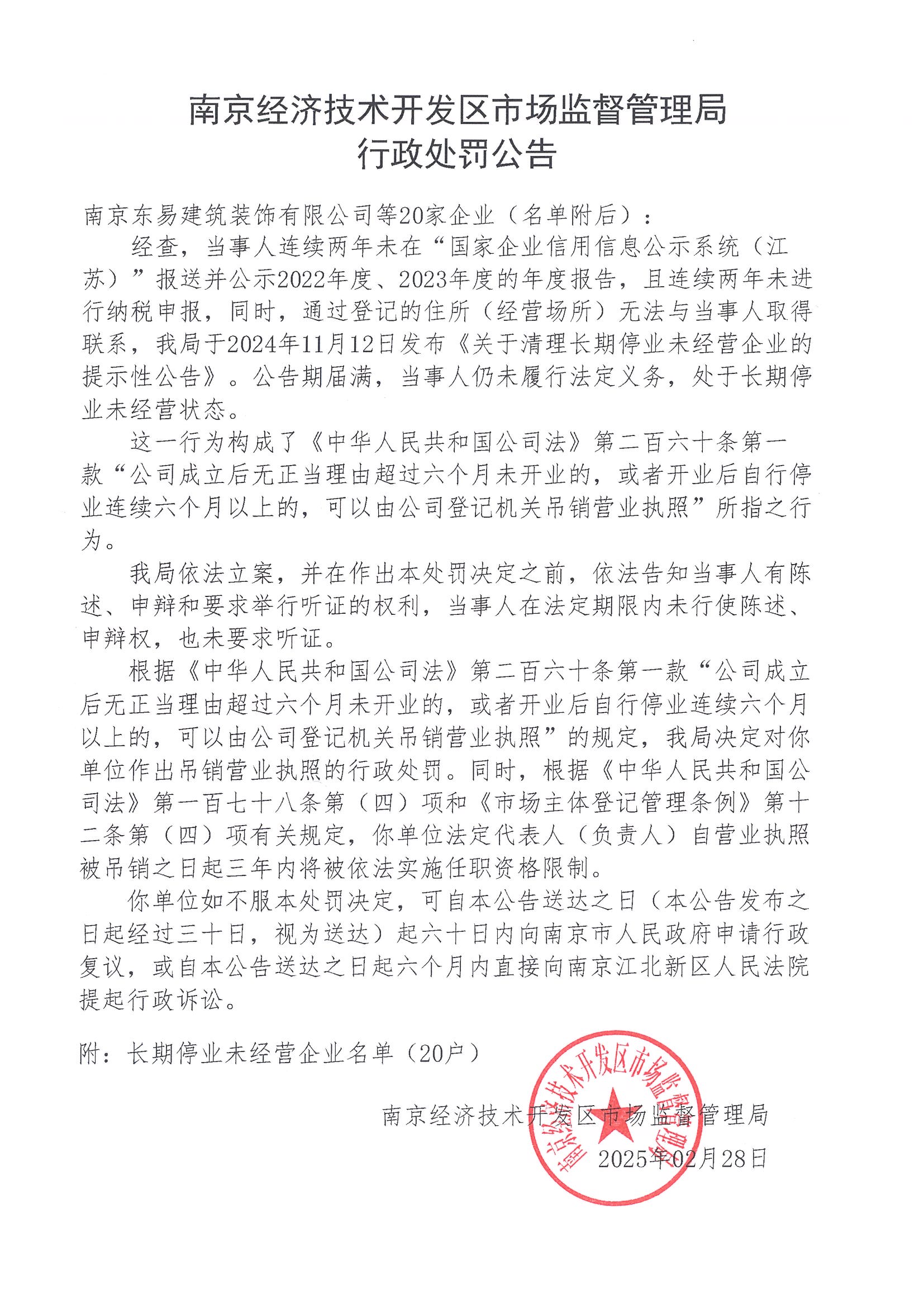 | 信息名称: | 南京经济技术开发区市场监督管理局行政处罚公告 | ||