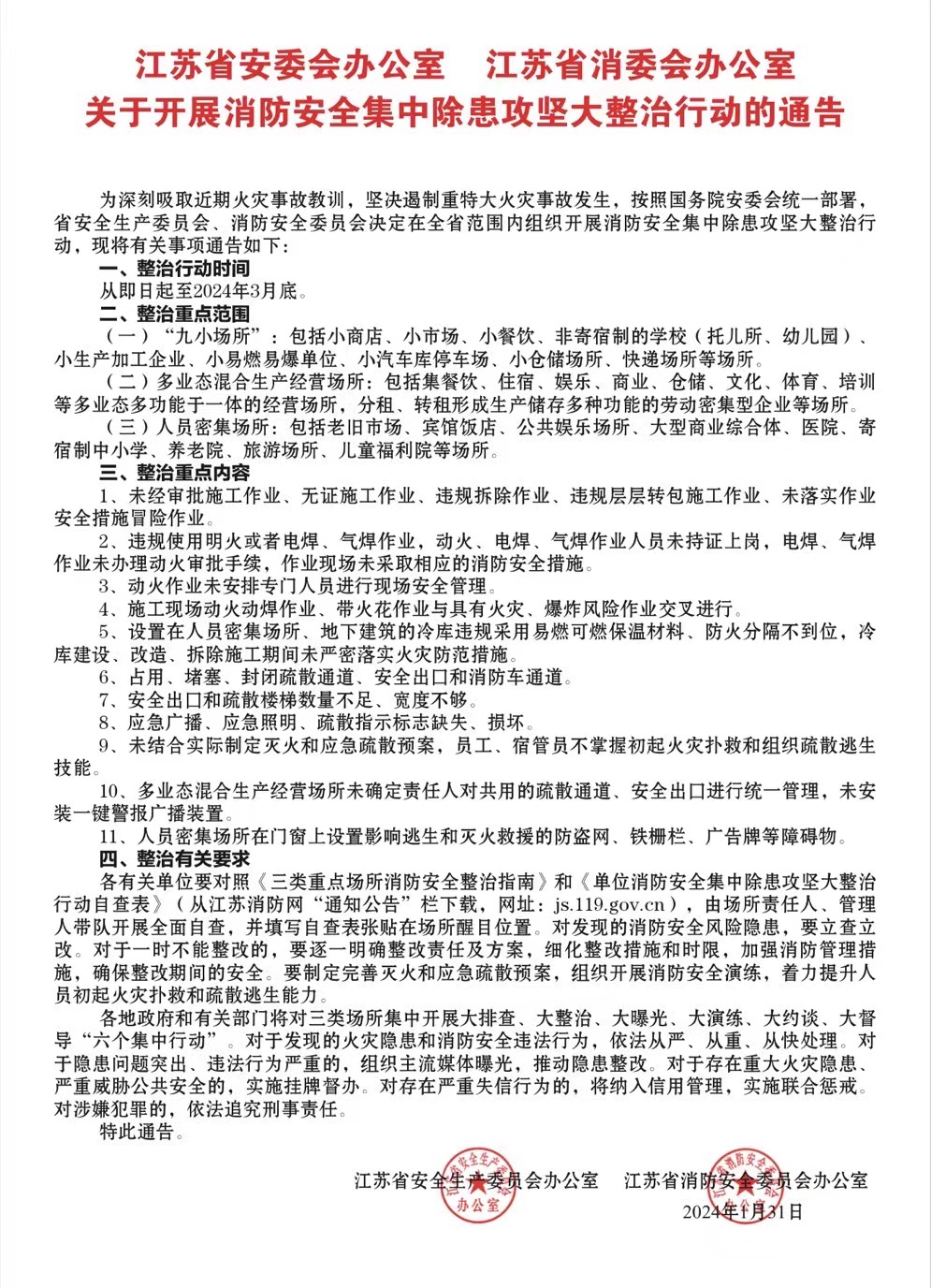 江苏省安委办、消委办:关于开展消防安全集中除患攻坚大整治行动的通告