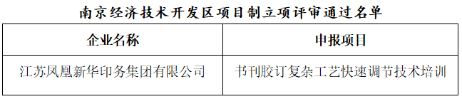 根据《南京市人力资源和社会保障局 南京市财政局关于 2021 年组织实施项目制培训的通知》(宁人社〔2021〕91号)及相关要求,南京经开区于2024年12月10日组织相关专家对江苏凤凰新华印务集团有限公司申报项目开展立项评审会。经过材料初审、立项评估会评审等环节,现将入围企业名单予以公示,公示自2024年12月11日至15日,公示期5天。