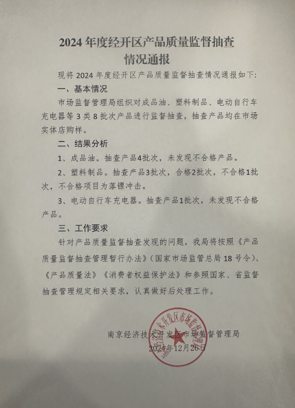 2024年度经开区产品质量监督抽查情况通报